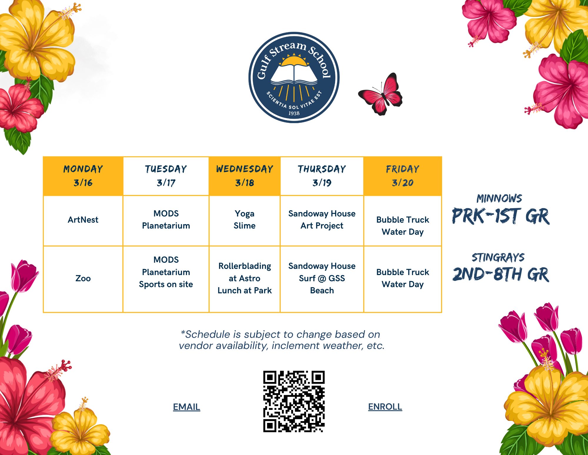 Our Stingrays (Grades 2nd–8th) will have an action-packed week including a visit to the Palm Beach Zoo, mini golf, a strawberry U-pick with animal encounters, surfing at the GSS beach, skating at Astro Skate, and our always-popular Bubble Truck Fun Friday.